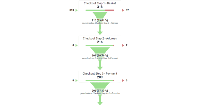 Eine Funnel-Analyse (Sales Funnel Analysis) ermöglicht es, den gesamten Verkaufsprozess zu optimieren, indem Schwachstellen identifiziert und behoben werden. Wenn beispielsweise viele Nutzer den Checkout-Prozess abbrechen, können Maßnahmen wie zusätzliche Zahlungsmöglichkeiten oder eine vereinfachte Formulargestaltung die Conversion-Rate deutlich erhöhen.